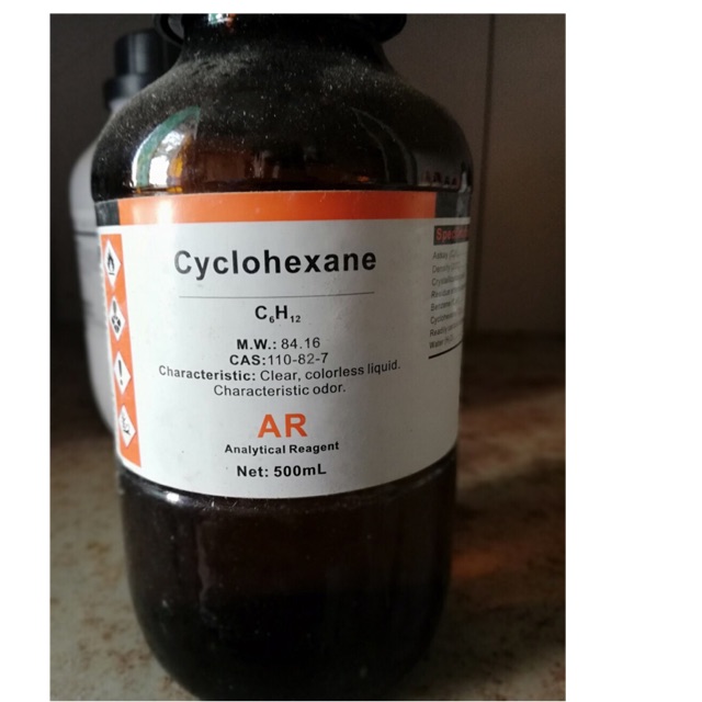 Hoá chất Cyclohexane CAS 110-82-7 C6H12 chai 500mlDung môi CYCLOHEXANONE (CYC) có công thức phân tử C6H10O, là một dung môi có khả năng bay hơi trung bình khá, có thể hòa tan tốt nhiều chất hữu cơ, nên thường được sử dụng làm nguyên liệu đầu vào cho việc điều chế các chất khác.