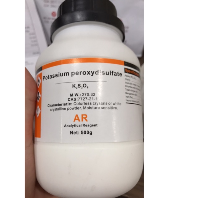 Hoá chất Potassium persulfate CAS 7727-21-1 K2S2O8 Xylong lọ 500gKali persunfat là hợp chất vô cơ với công thức K₂S₂O₈. Còn được gọi là kali peroxydisunfat hoặc KPS, nó là một chất rắn màu trắng hòa tan nhiều trong nước. Muối này là một chất oxy hóa mạnh, thường được sử dụng để bắt đầu phản ứng trùng hợp.