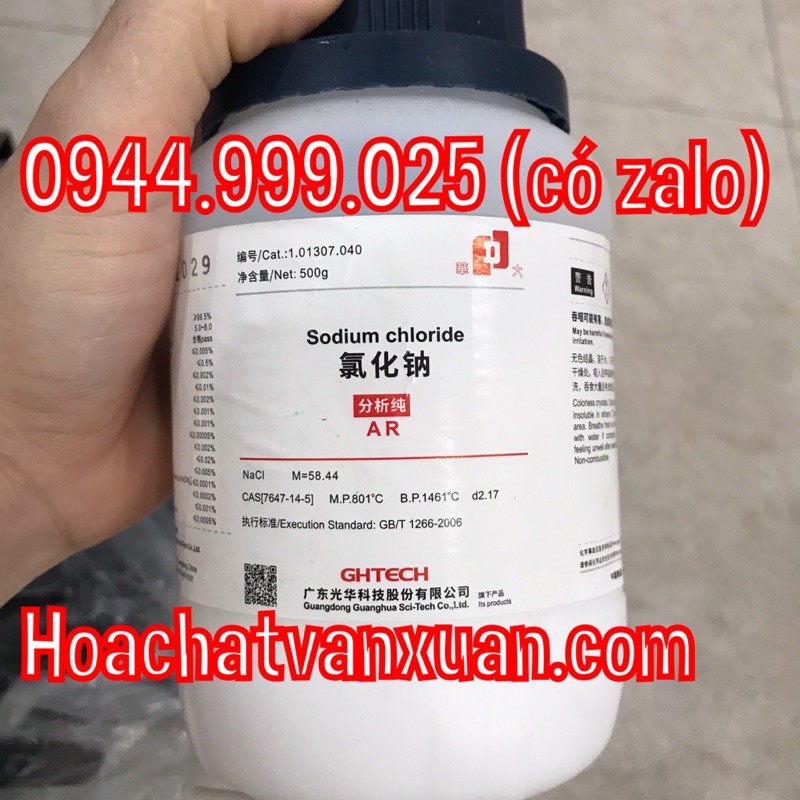 Hoá chất sodium chloride NaCl CAS 7647-14-5 lọ 500g natri cloruatảClorua natri, còn gọi là natri clorua, muối ăn, muối, muối mỏ, hay halua, là hợp chất hóa học với công thức hóa học NaCl. Clorua natri là muối chủ yếu tạo ra độ mặn trong các đại dương và của chất lỏng ngoại bào của nhiều cơ thể đa bào.