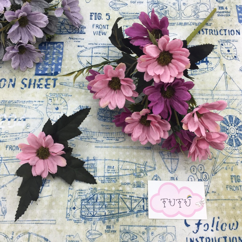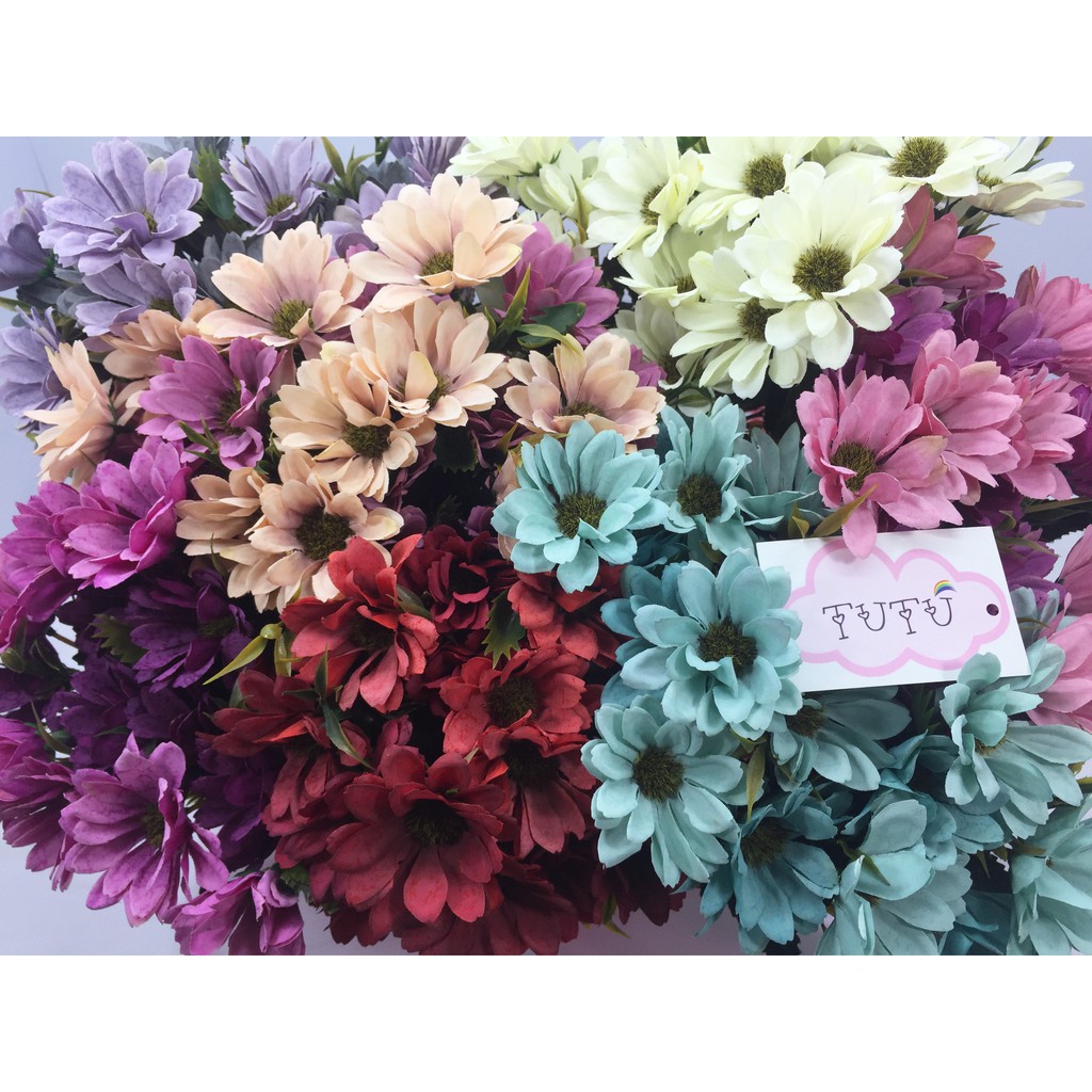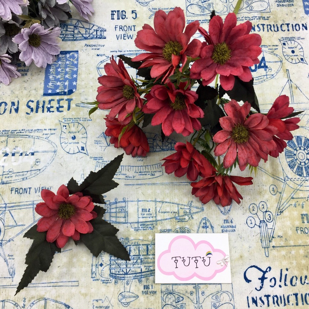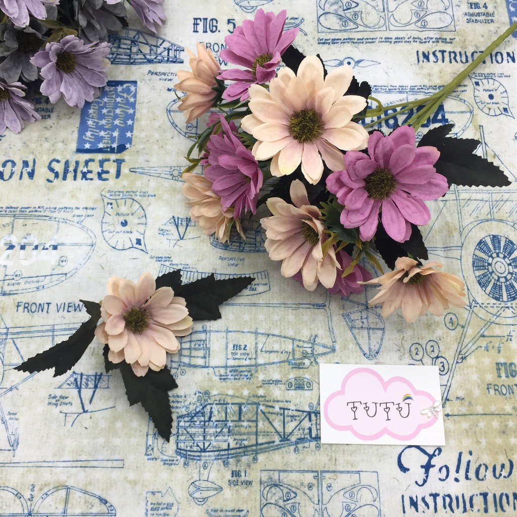 Cúc hai lớp cánh nguyên cành, có thể dùng cắm trực tiếp vào lọ hoa trang trí hoặc chỉ dùng đầu hoa và lá để làm đồ handmade, trang trí váy áo ...Trên mỗi bông hoa đều có vân cánh tự nhiên, mỗi chùm có 2 màu hoa pha trộn hoà hợp. Chùm có hơi hướng vintage nên sẽ mang đến phong cách riêng cho người sử dụng. Có 7 màu để lựa chọn: xanh ngọc, tím hồng, tím xám, tím kem, tím đậm, đỏ, trắng.