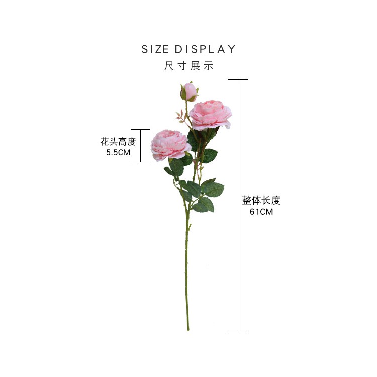 ✔️ Cành hoa giả gồm 3 bông (2 to 1 nụ). Chiều dài 1 cành là 61cm, chiều dài bông hoa là 5.5cm, đường kính 7-9cm.