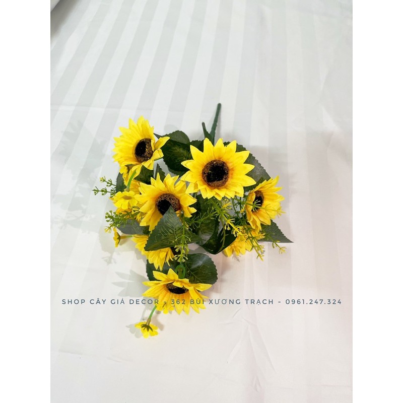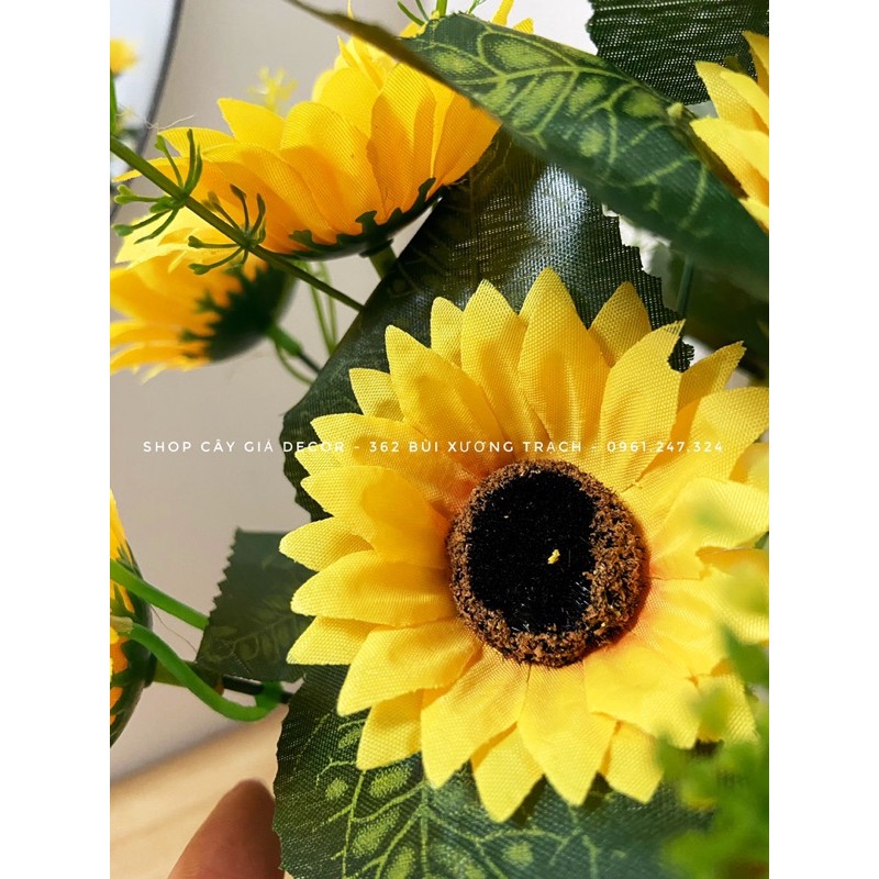 Mỗi cụm gồm có 10 bông hoa hướng dương to và nhiều bông hoa nhỏ, nhiều lá y hìnhMàu sắc rực rỡ và giống thật đến 95%, decor cực xinh và không bao giờ lo tưới nước hay cây bị héo =)))