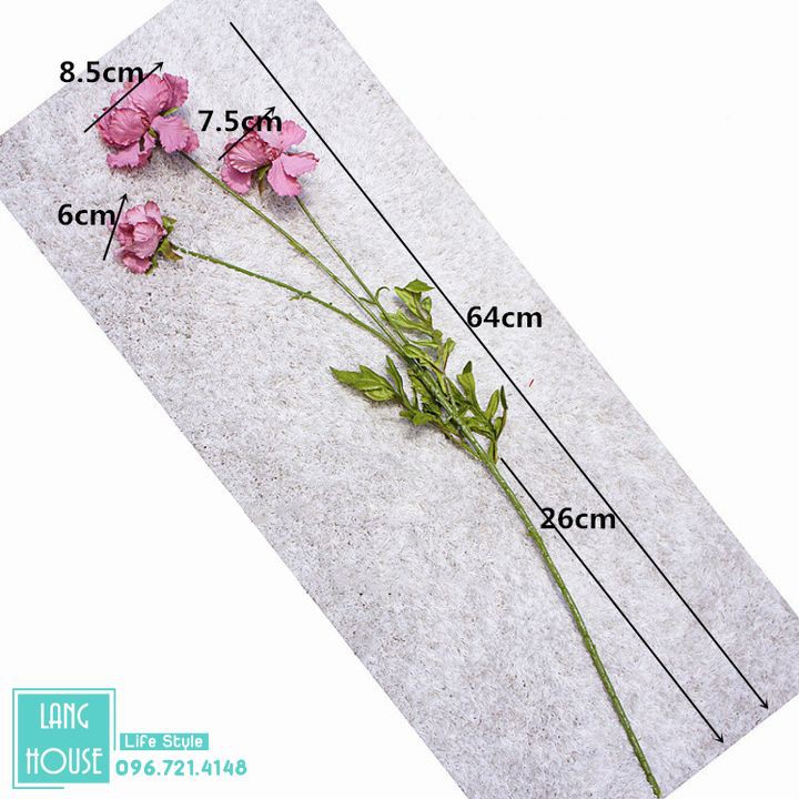 ✅Cành dài 64cm. Một cành có 3 bông, đường kính bông lần lượt là 8.5cm, 7,5cm, và 6cm.