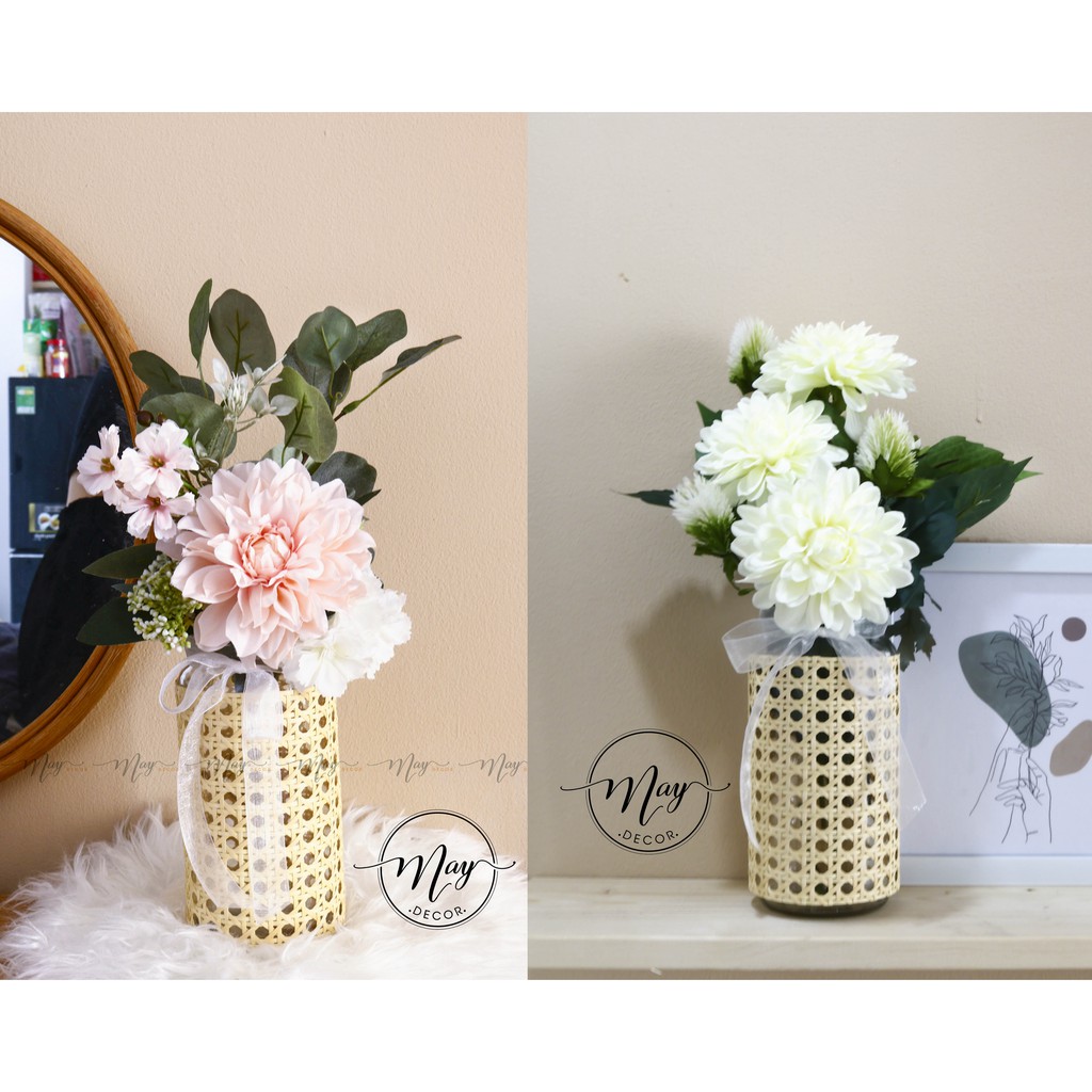 Hoa giả, Hoa lụa, Lọ mây đan mix hoa trắng, hồng