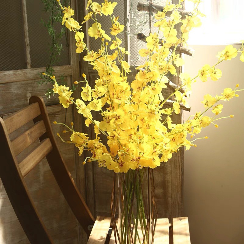 Hoa hoàng yến Osaka(hoa lan vũ nữ vải) có chiều dài lớn thường được cắm với các loại bình có chiều cao trên 35cm, nếu cắm các loại bình thấp khoảng 20cm chúng ta cần bấm ngắn cành hoa để có thể phù hợp với bình.