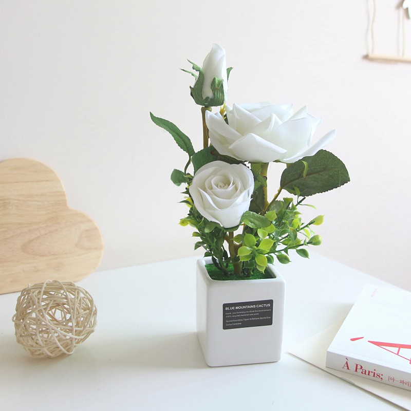 Hoa giả trang trí để bàn đẹp, chậu hoa hồng giả loại 3 bông KHALIK - HF009