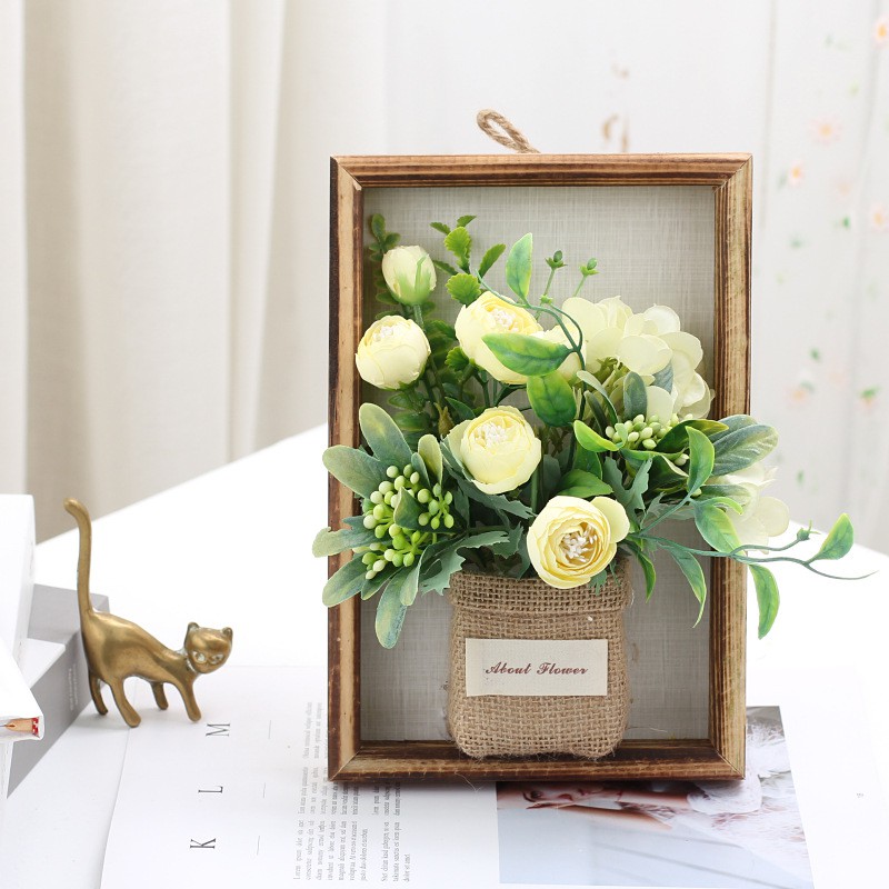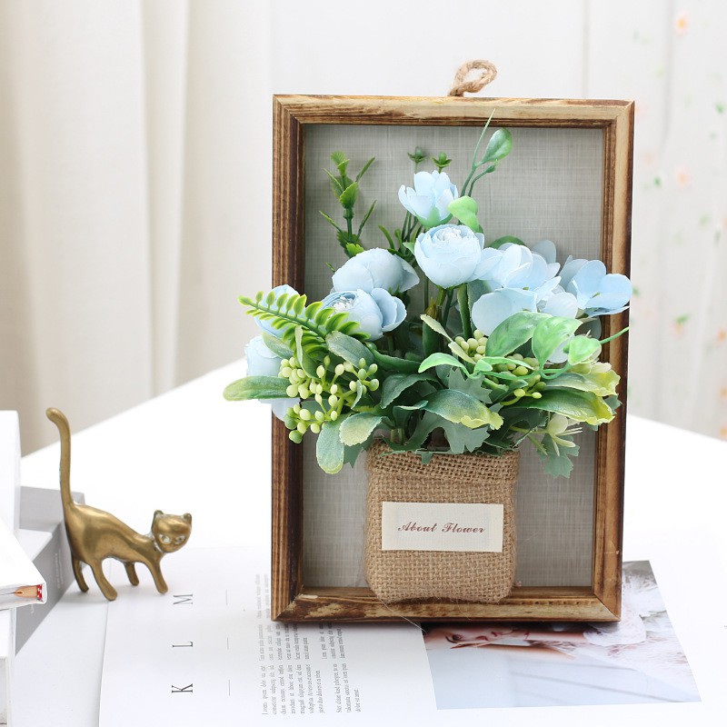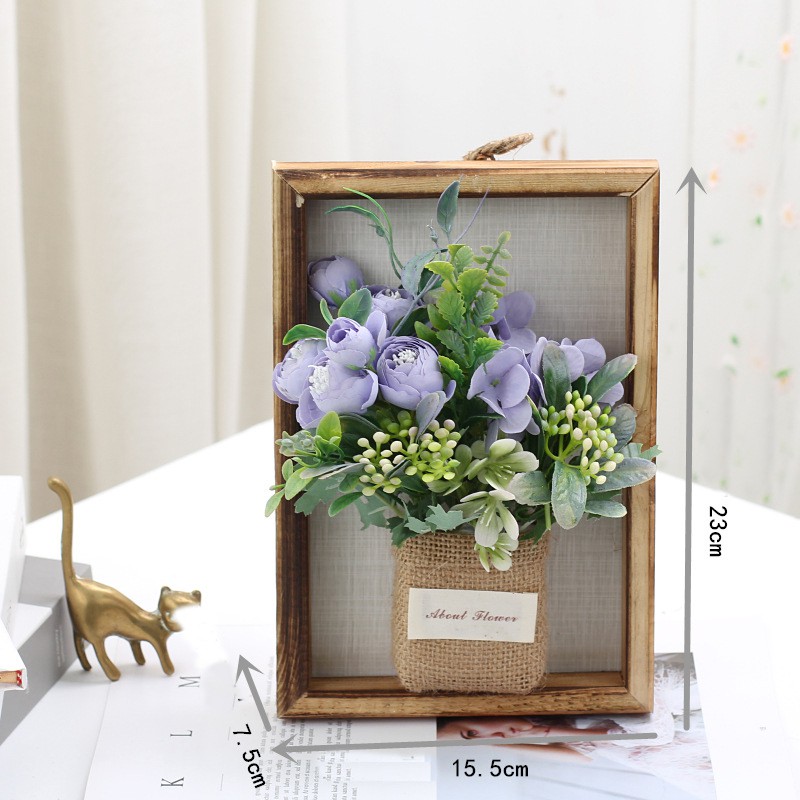 [Chất liệu]: Hoa được làm bằng nhựa, vải lụa... chậu hoa bằng bằng vải bố; Khung ảnh bằng gỗ.