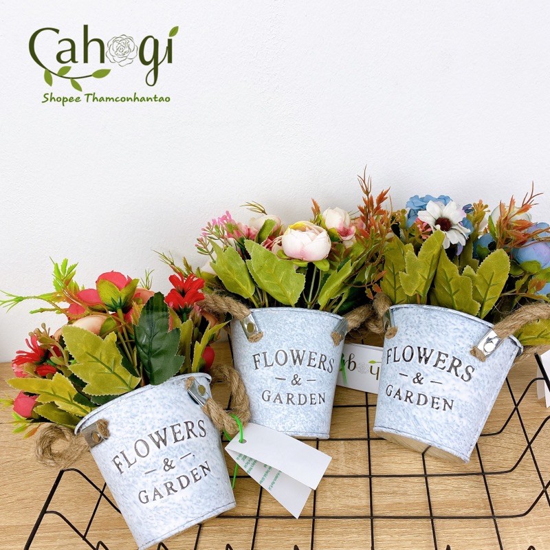 Xô hoa được làm theo phong cách cổ điển. màu sắc hoa trầm lắng mang tính hoài niệm, tay cầm bằng dây gai tạo thêm cảm giác vinatge cho sản phẩm.