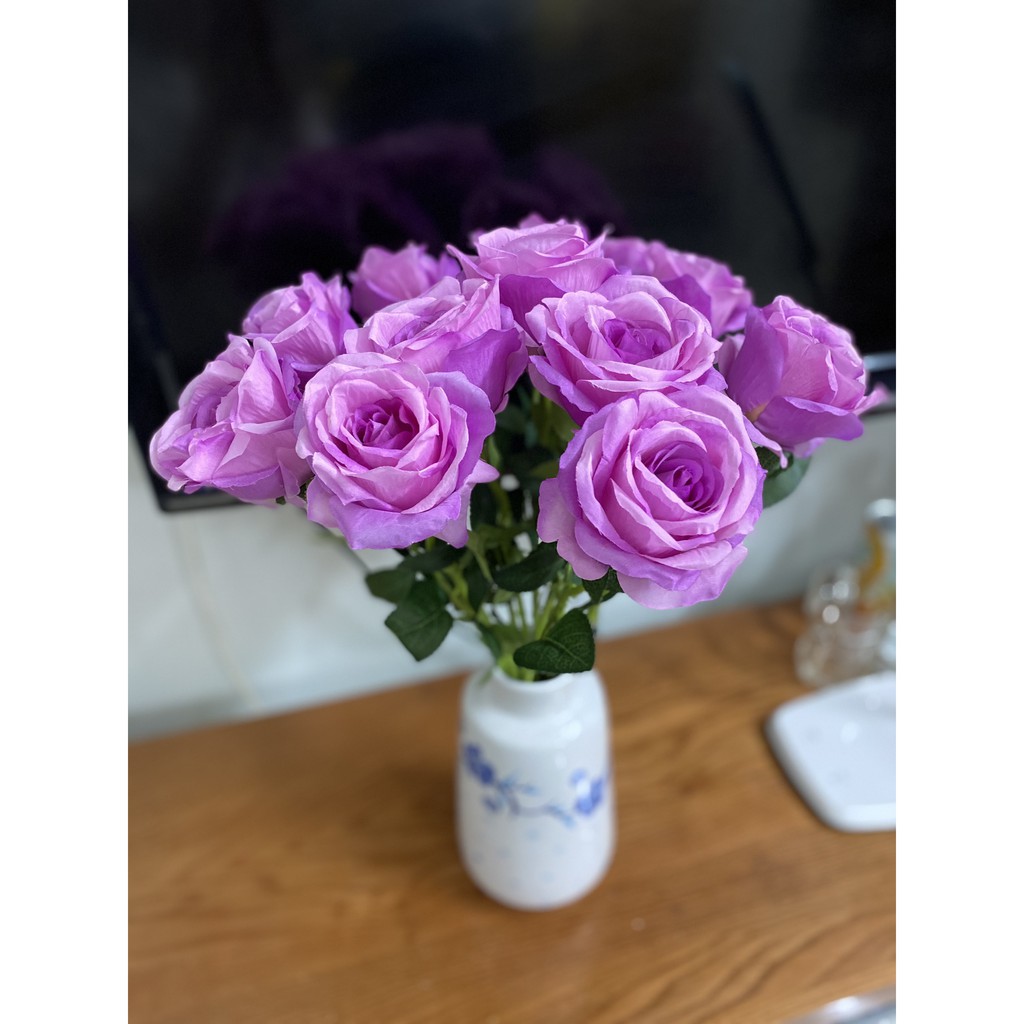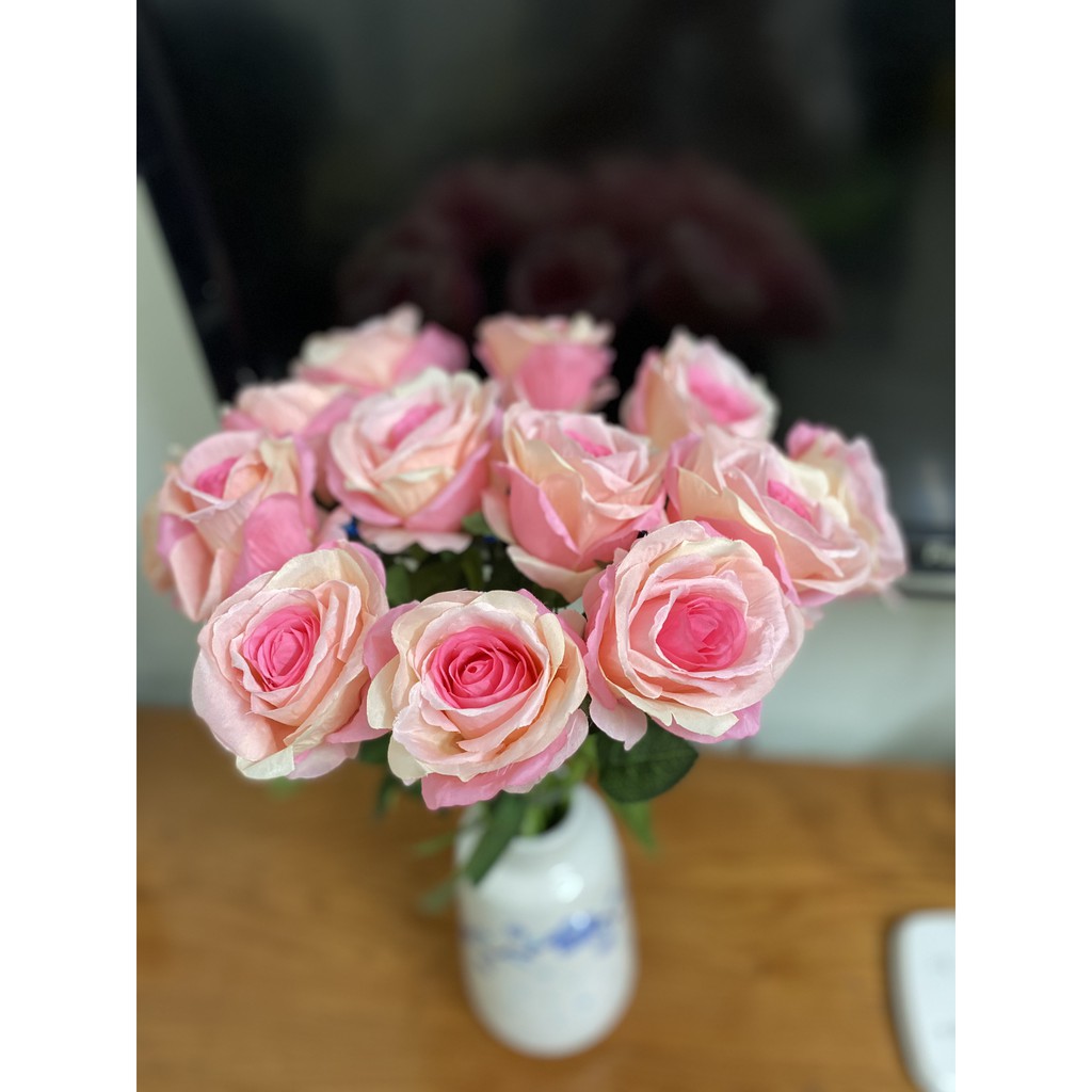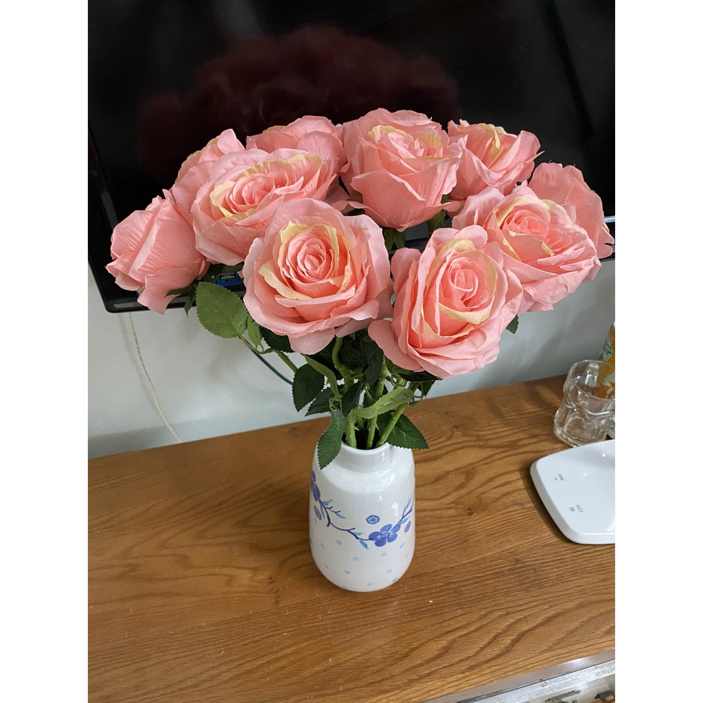 MÔ TẢ SẢN PHẨM✔️ Cành hoa giả gồm 1 bông size to. Chiều dài mỗi cành hồng 51cm, Đường kính bông hoa 8cm cao 7cm