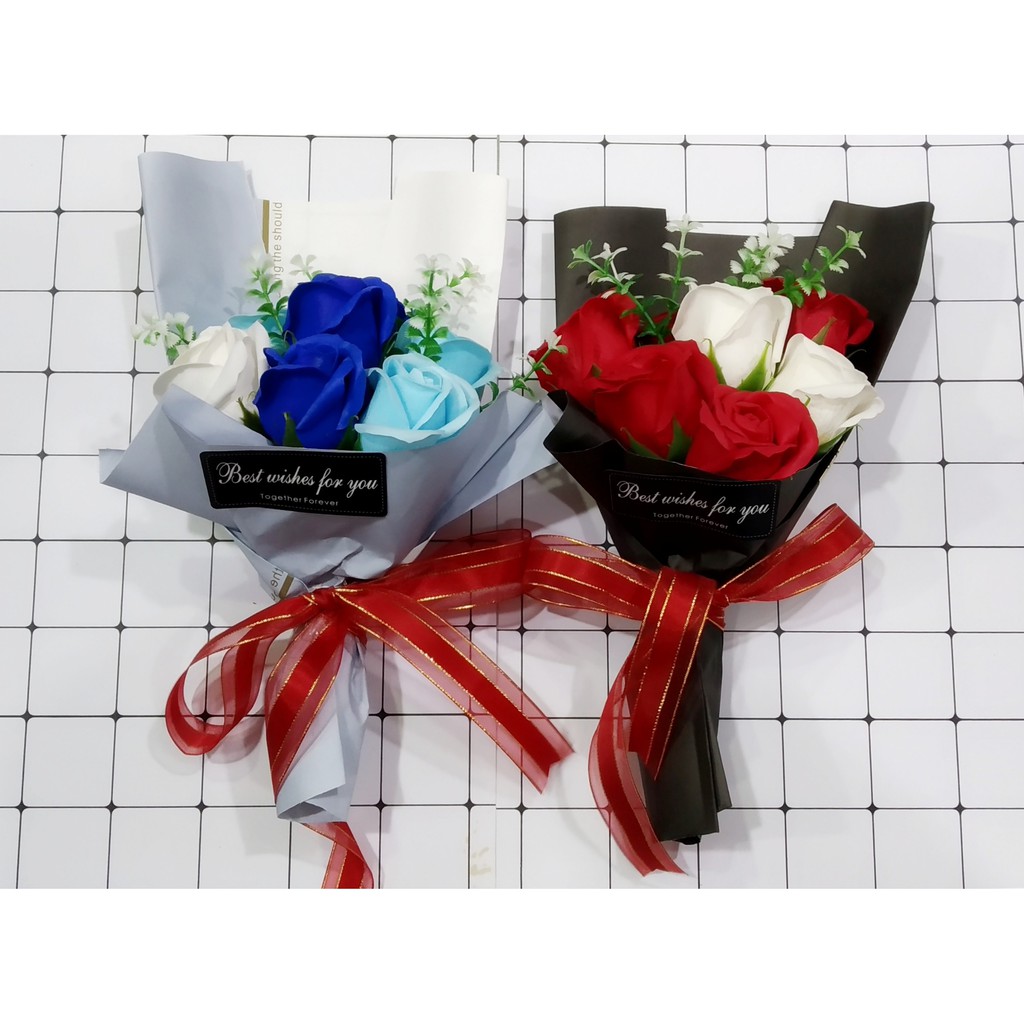 Hoa hồng sáp 7 bông và hoa điểm nhựa giấy trong