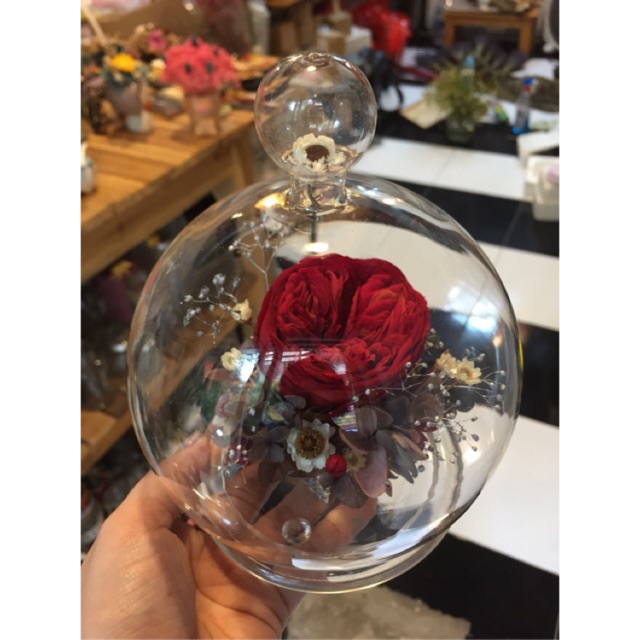 Đây là sản phẩm được làm dựa trên bộ phim Người đẹp và Quái vật và là sản phẩm mới của nhà Én. Hoa hồng vĩnh cửu size L được trang trí thủ công trong vòm kính thủy tinh tạo nên 1 món quà vô cùng lãng mạn và độc đáo. giữ nguyên màu sắc, mềm mại và nền nã y hệt như những bông hoa tươi mới cắt từ cây trong vườn. Với công nghê ướp hoa tiên tiến, hoa được ướp sẽ không bị khô, cứng và vẫn giữ được nước trong các cánh hoa. Hoa sẽ trông tươi tắn, mềm mại và giữ được màu sắc trong suốt thời gian sử dụng. Sản phẩm được làm theo yêu cầu khách hàng và hoàn toàn handmade, thích hợp làm quà tặng mẹ, người yêu, bạn thân.... mừng sinh nhật, 20/10, 8/3 hoặc 14/2....- Hoa hồng size L có đường kính hoa 6-8cm
