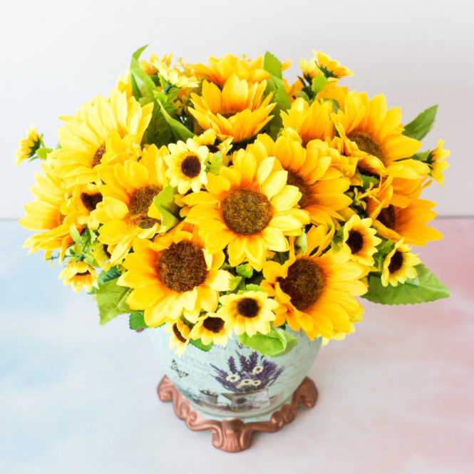 ** Chùm hướng dương sắc màu rực rỡ, tươi sang, dùng để trang trí để bàn khách, bàn làm việc và trang điểm...