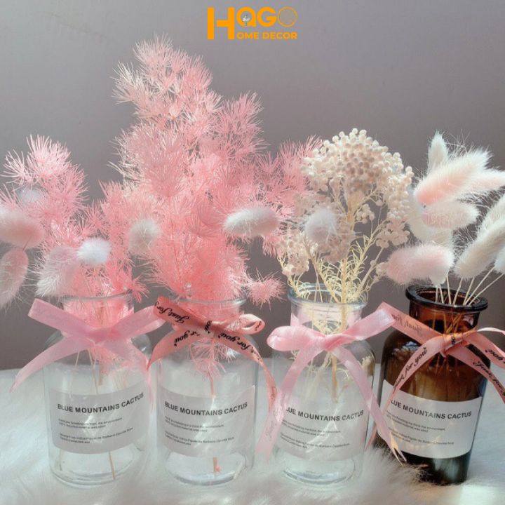 Giới thiệu Hoa khô, lọ hoa thủy tinh kèm hoa đuôi thỏ,cỏ lau Mỹ cắm sẵn cao 25cm trang trí, decor nhà cửa