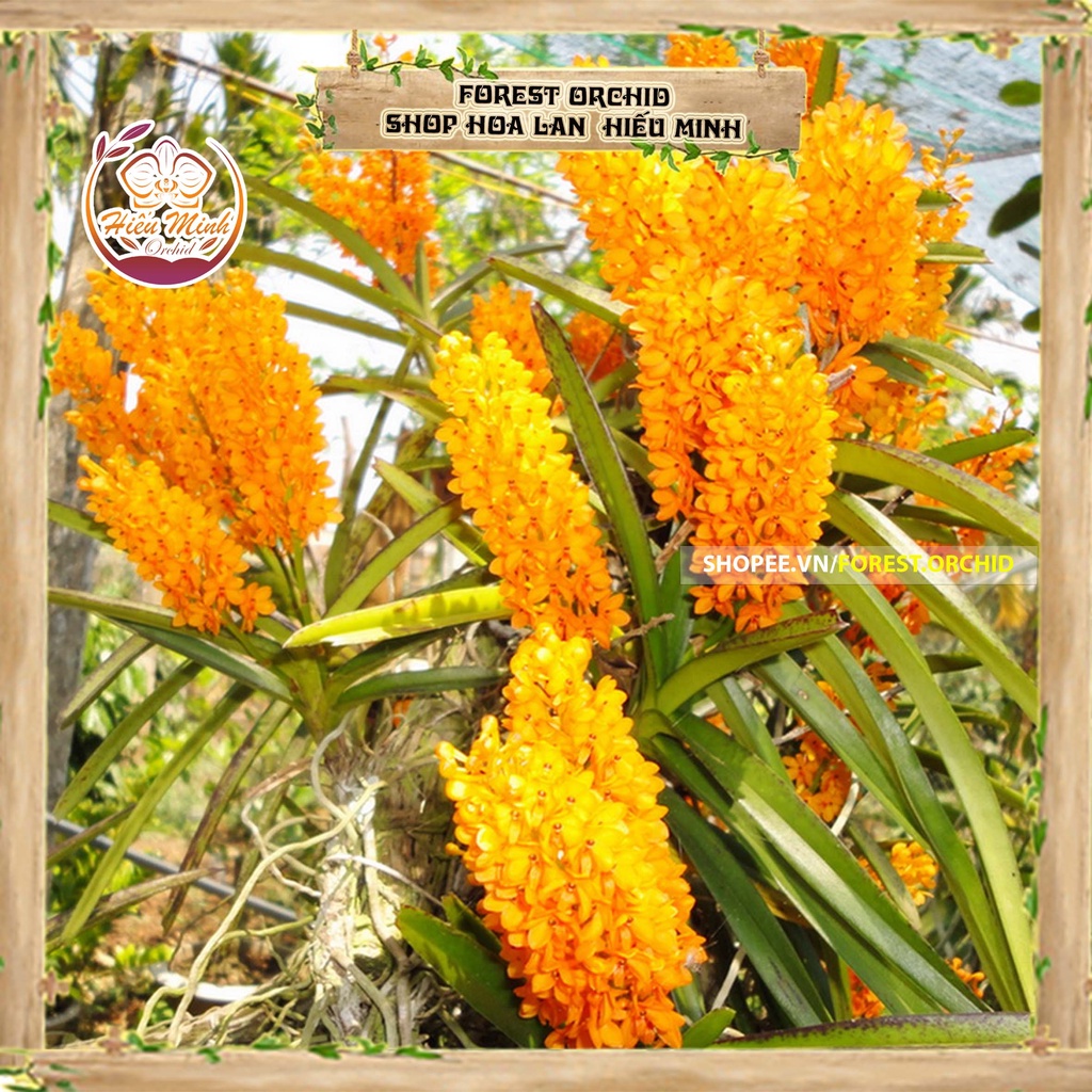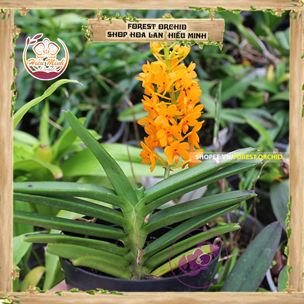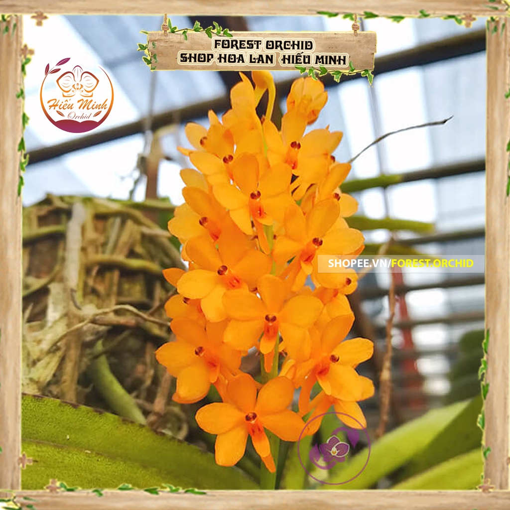 Hoa Lan đột biến Hỏa Hoàng Cam, hay còn gọi là Hỏa Hoàng (Tên gọi Hỏa Hoàng có lẽ bắt nguồn từ đặc điểm cây gồm rất nhiều chùm hoa nhỏ sắc cam nổi bật giữa màu lá xanh tựa hồ như ngọn đuốc), có kích thước nhỏ bé (mini) – cao khoảng 6-10 cm là có thể bắt đầu ra hoa. Là loại phong lan đơn thân ít chia nhánh nhưng khi cây sung mạnh cao khoảng trên 20 cm hoặc lúc đọt bị tổn thương thì ở gốc cũng có thể cho 2-3 nhánh con. Lá rất dày, cứng xanh đậm, hơi cong, xếp khít nhau thành 2 hàng dọc thân. Lòng phiến lá cong lõm hình chữ V. Đỉnh lá có hai thùy với răng nhọn như kiểu Vanda.