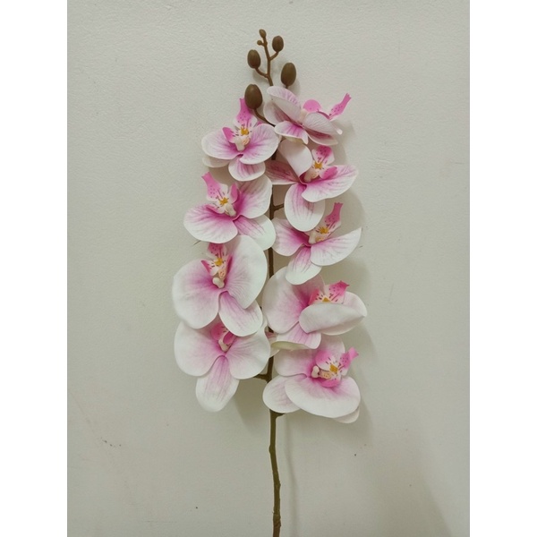 Hoa lan Hồ điệp hàng nhậ khâurĐộ dài cành 90cm, mỗi cành gồm 9 bông lớn nhỏ. Hoa lớn nhất đường kính 10-11cm. Chất liệu cao su bền màu trông giống thật.