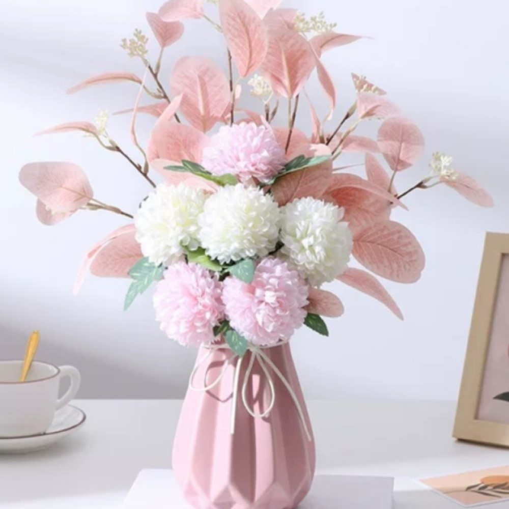 Hoa lụa, lọ hoa cúc pingpong để bàn trang trí kệ tủ phong cách mới