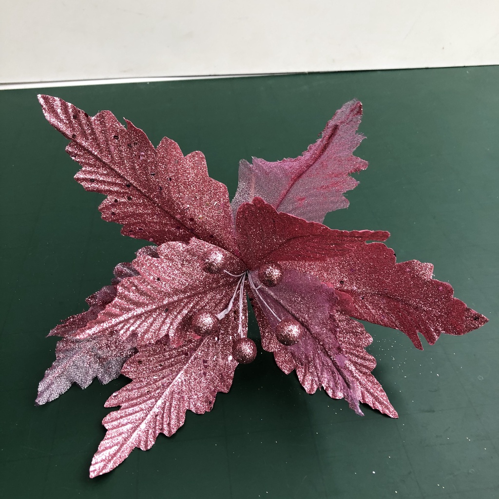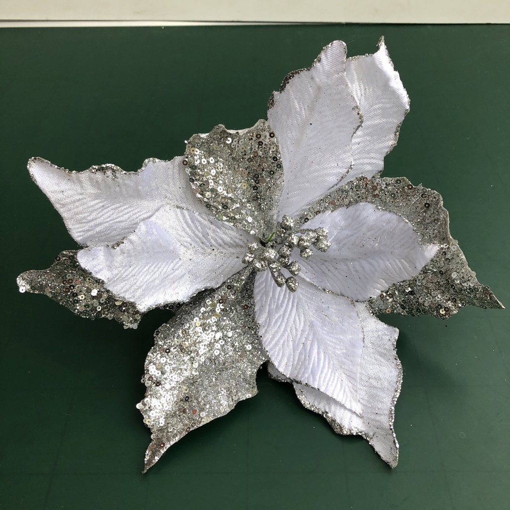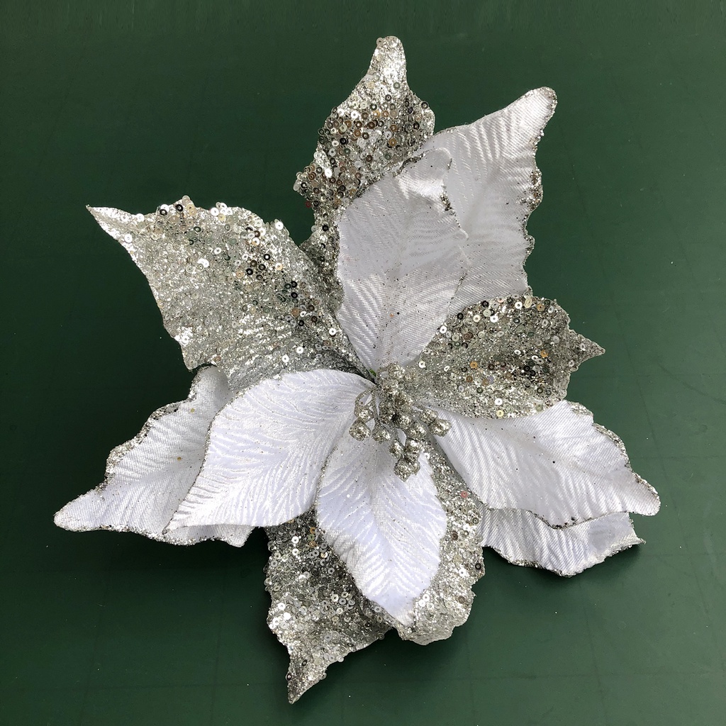 Bông Hoa được phủ nhũ lấp lánh rất đẹp, có thể dùng để trang trí trên cây thông Noel hoặc vòng nguyệt quế Giáng sinh