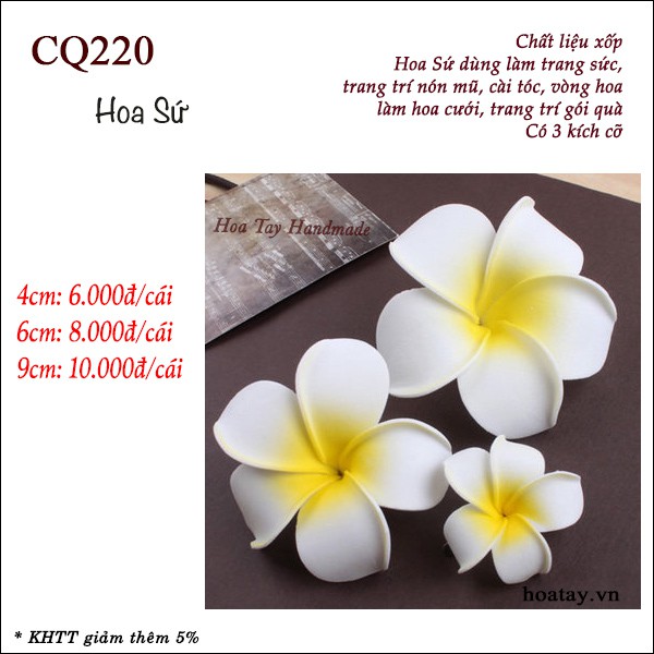 Hoa Sứ dùng trang trí các sản phẩm thủ công. Đường kính hoa 4cm, 6cm và 9cm.Hoa bằng xốp, Hoa sứ dùng làm trang sức, trang trí nón mũ, làm cài tóc, vòng hoa, làm hoa cưới, trang trí gói quà, trang trí tiệc cưới, thiệp handmade, .....