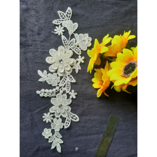hoa được thêu 3D chỉ nổi có màu xanh nhạt và đính hạt nhụy hoa. dùng kết vải. sử dụng kim chỉ để kết.. kích thước sản phẩm dài 27cmGiá BABAon