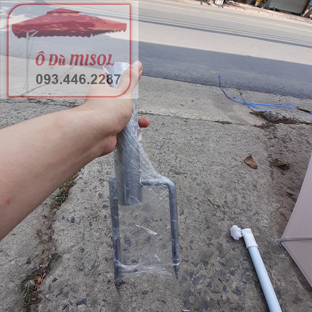 Dù nguyên liệu Polyester chất lượng cao, chống thấm cực tốtđế dù hàng sắt đặc chắc chắn, chịu được búa như hình, chân đế cắm xuống mặt đất nối với cây dù nhanh gọn