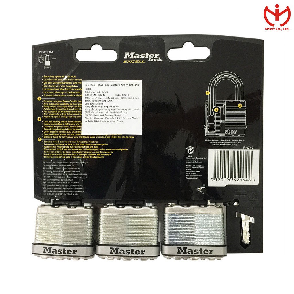 [Hỏa tốc HCM] Bộ 3 ổ khóa Master Lock M5TRILF rộng 50mm càng dài 38mm dùng chung 4 chìa - MSOFT