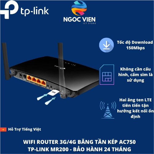 TP-Link AC 750Mbps Bộ Phát WiFi 3G/4G LTE Wi-Fi Băng tần kép -Archer MR200 - Hàng Chính HãngKhông cần cấu hình – chỉ cần cắm SIM và sử dụng, tương thích với các thẻ SIM của các nhà mạng Mobifone, Vinaphone, Viettel, Vietnamobile