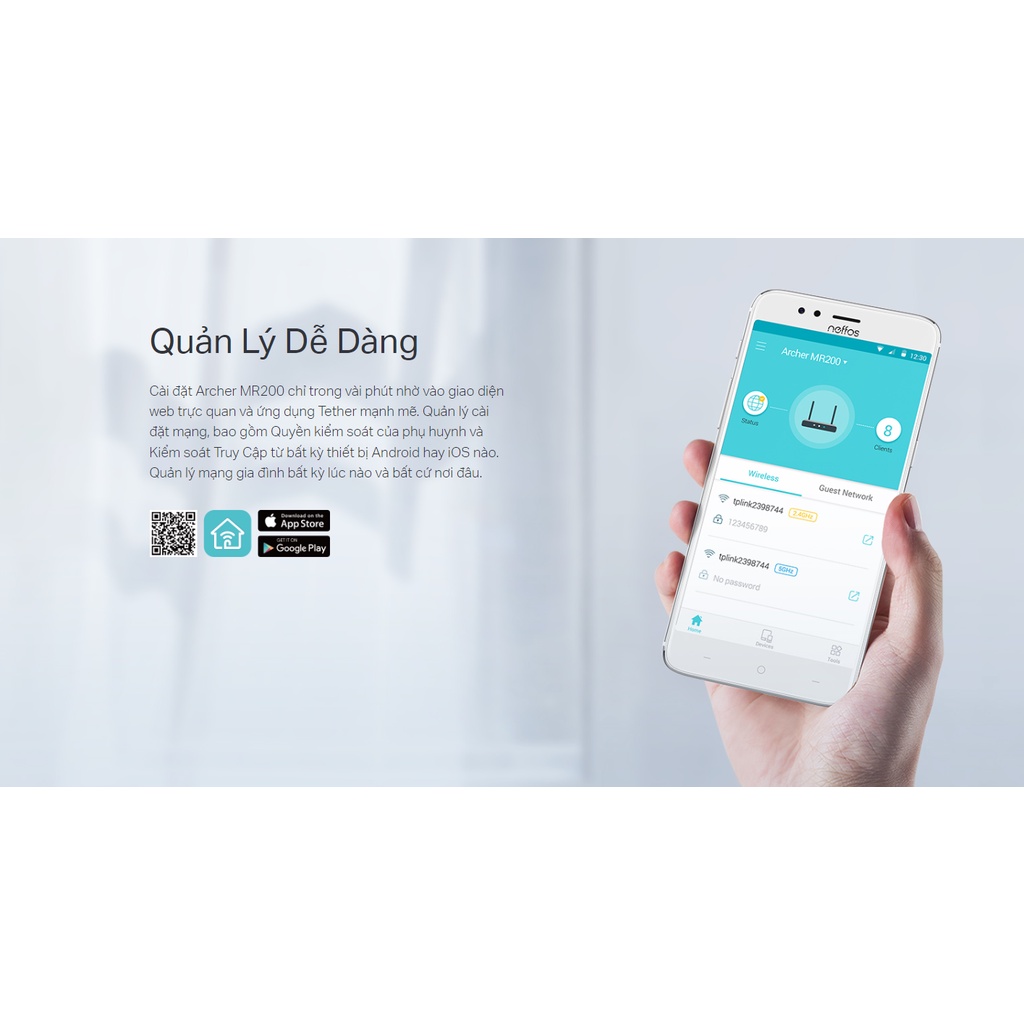 Cài đặt Archer MR200 chỉ trong vài phút nhờ vào giao diện web trực quan và ứng dụng Tether mạnh mẽ. Quản lý cài đặt mạng, bao gồm Quyền kiểm soát của phụ huynh và Kiểm soát Truy Cập từ bất kỳ thiết bị Android hay iOS nào. Quản lý mạng gia đình bất kỳ lúc nào và bất cứ nơi đâu.