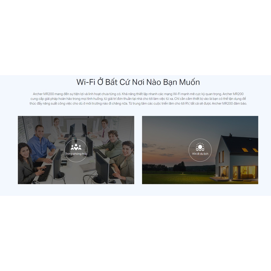 Archer MR200 mang đến sự tiện lợi và linh hoạt chưa từng có. Khả năng thiết lập nhanh các mạng Wi-Fi mạnh mẽ cực kỳ quan trọng. Archer MR200 cung cấp giải pháp hoàn hảo trong mọi tình huống, từ giải trí đơn thuần tại nhà cho tới làm việc từ xa. Chỉ cần cắm thiết bị vào là bạn có thể tận dụng để thúc đẩy năng suất công việc cho dù ở môi trường nào đi chăng nữa. Từ trung tâm các cuộc triển lãm cho tới RV, tất cả sẽ được Archer MR200 đảm bảo.