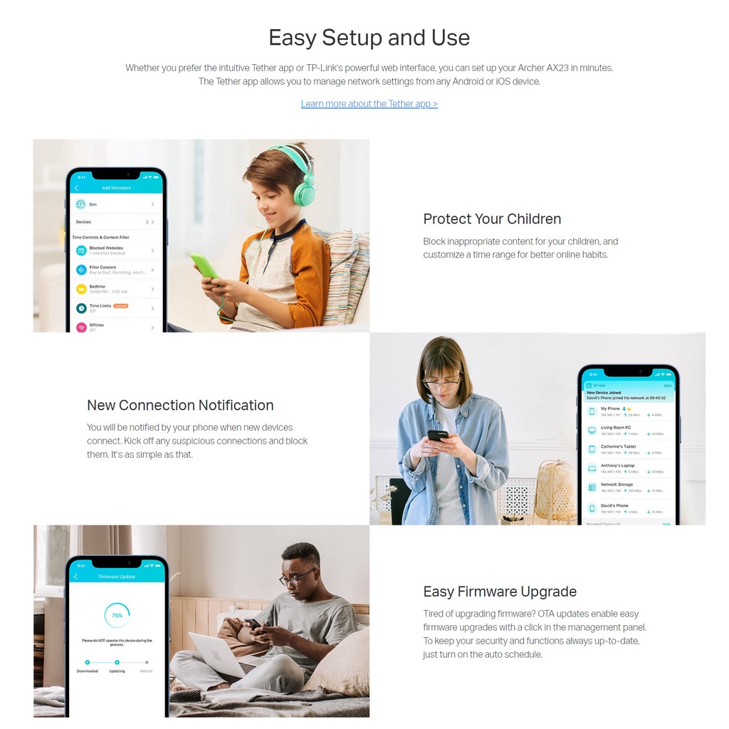 - Cài Đặt Dễ Dàng – Cài đặt router của bạn trong vài phút với ứng dụng Tether TP-Link mạnh mẽ.