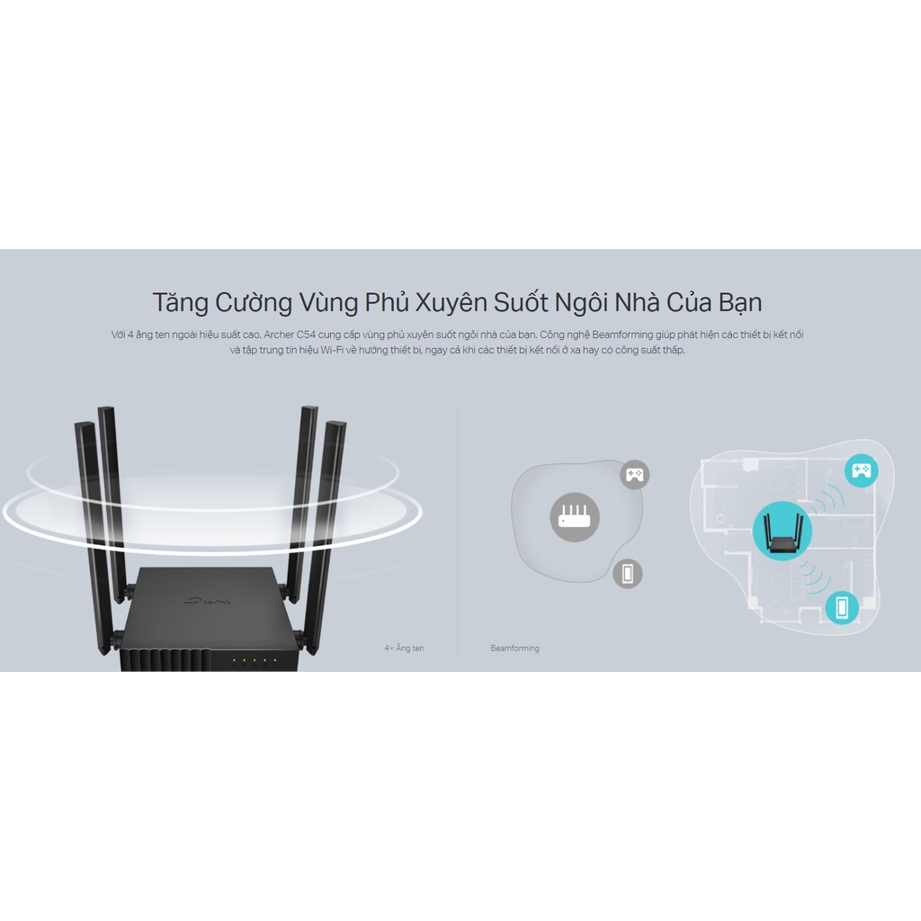 Với 4 ăng ten ngoài hiệu suất cao, Archer C54 cung cấp vùng phủ xuyên suốt ngôi nhà của bạn. Công nghệ Beamforming giúp phát hiện các thiết bị kết nối và tập trung tín hiệu Wi-Fi về hướng thiết bị, ngay cả khi các thiết bị kết nối ở xa hay có công suất thấp.