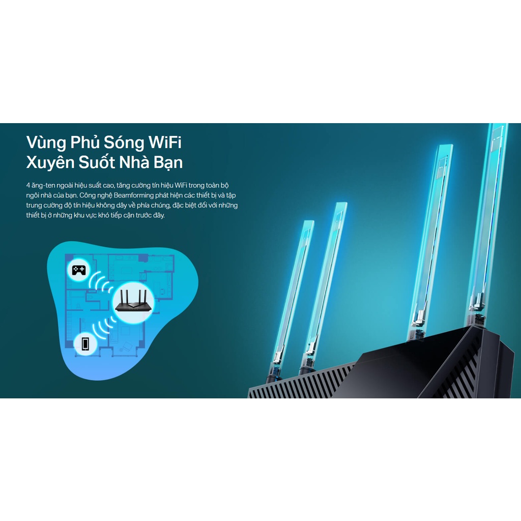 - Mở rộng phạm vi phủ sóng Wi-Fi — Bốn ăng-ten bên ngoài có độ lợi cao và công nghệ Beamforming kết hợp với nhau để mở rộng Wi-Fi mạnh mẽ, đáng tin cậy trong toàn bộ ngôi nhà của bạn.