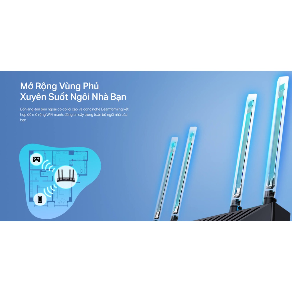 - Phạm vi phủ sóng Wi-Fi mở rộng — Bốn ăng-ten bên ngoài có độ lợi cao và công nghệ Beamforming kết hợp với nhau để mở rộng Wi-Fi mạnh mẽ, đáng tin cậy trong toàn bộ ngôi nhà của bạn.