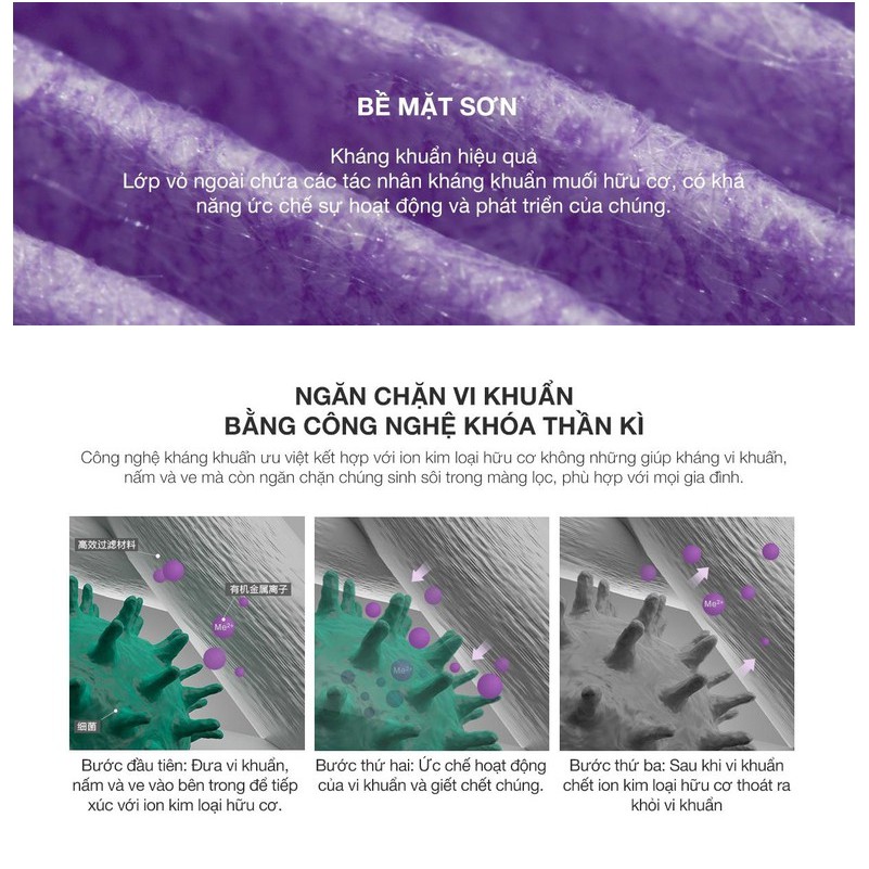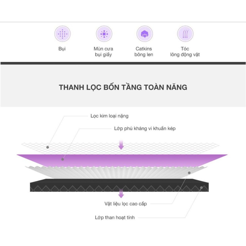 - Loại bỏ hiệu quả vi khuẩn, các loại bụi bẩn trong không khí. Lớp kháng khuẩn được thiết kế đặc biệt giúp khử sạch mọi vi khuẩn và đem lại không khí trong lành. Lõi lọc Formaldehyde có bốn lớp lọc, do đó hiệu suất hoạt động cũng gấp 4 lần lõi lọc bình thường. Thiết kế hình trụ dài của lõi lọc kiểu nếp gấp cũng giúp tăng diện tích tiếp xúc với không khí, từ đó tăng hiệu quả lọc cao hơn.