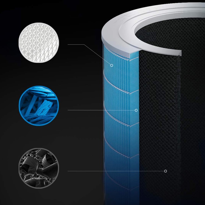 - 3 lớp lọc khác nhau, không chỉ loại bỏ các hạt bụi nhỏ PM2.5 mà còn làm sạch hiệu quả các chất độc hại như formaldehyde, vi khuẩn, tóc, mảnh vụn mịn, đồng thời có khả năng chống dầu, axit, kiềm