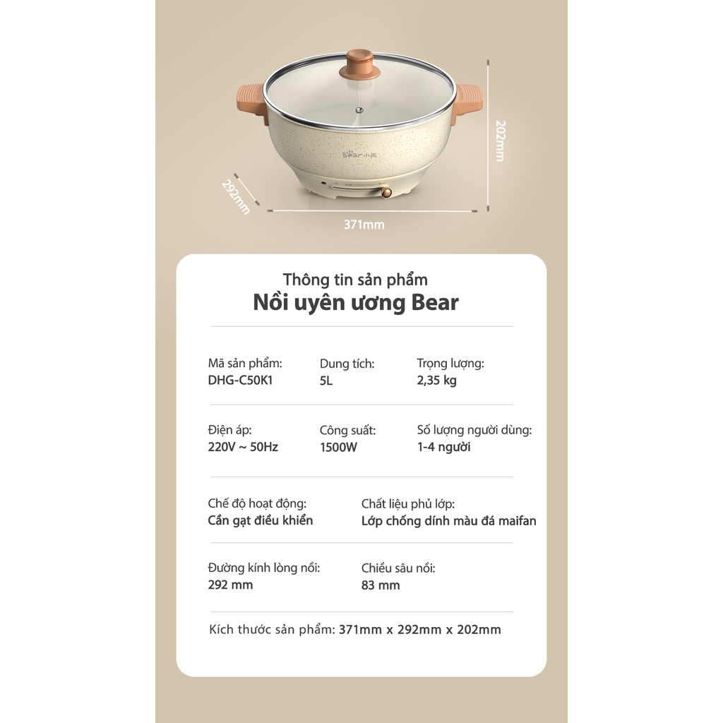 ✔ Sở hữu phong cách thời thượng, đẳng cấp, chiếc nồi lẩu uyên ương Bear DHG-C50K1 có hình dáng nồi rất trang nhã, màu sắc nhã nhặn, sang trọng, xứng đáng để chị em nội trợ thêm ngay vào giỏ hàng của mình ngay từ cái nhìn đầu tiên.