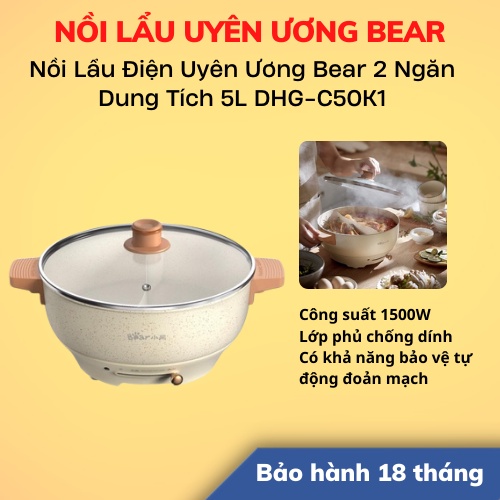 [Hỏa tốc - HCM] Nồi Lẩu Điện Uyên Ương Bear 2 Ngăn Dung Tích 5L DHG-C50K1 | Hàng Chính Hãng | Bảo Hành 18T | LSB Store