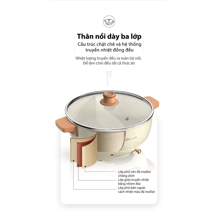 ✅Sở hữu phong cách thời thượng, đẳng cấp, chiếc nồi lẩu uyên ương Bear DHG-C50K1 có hình dáng nồi rất trang nhã, màu sắc nhã nhặn, sang trọng, xứng đáng để chị em nội trợ thêm ngay vào giỏ hàng của mình ngay từ cái nhìn đầu tiên.