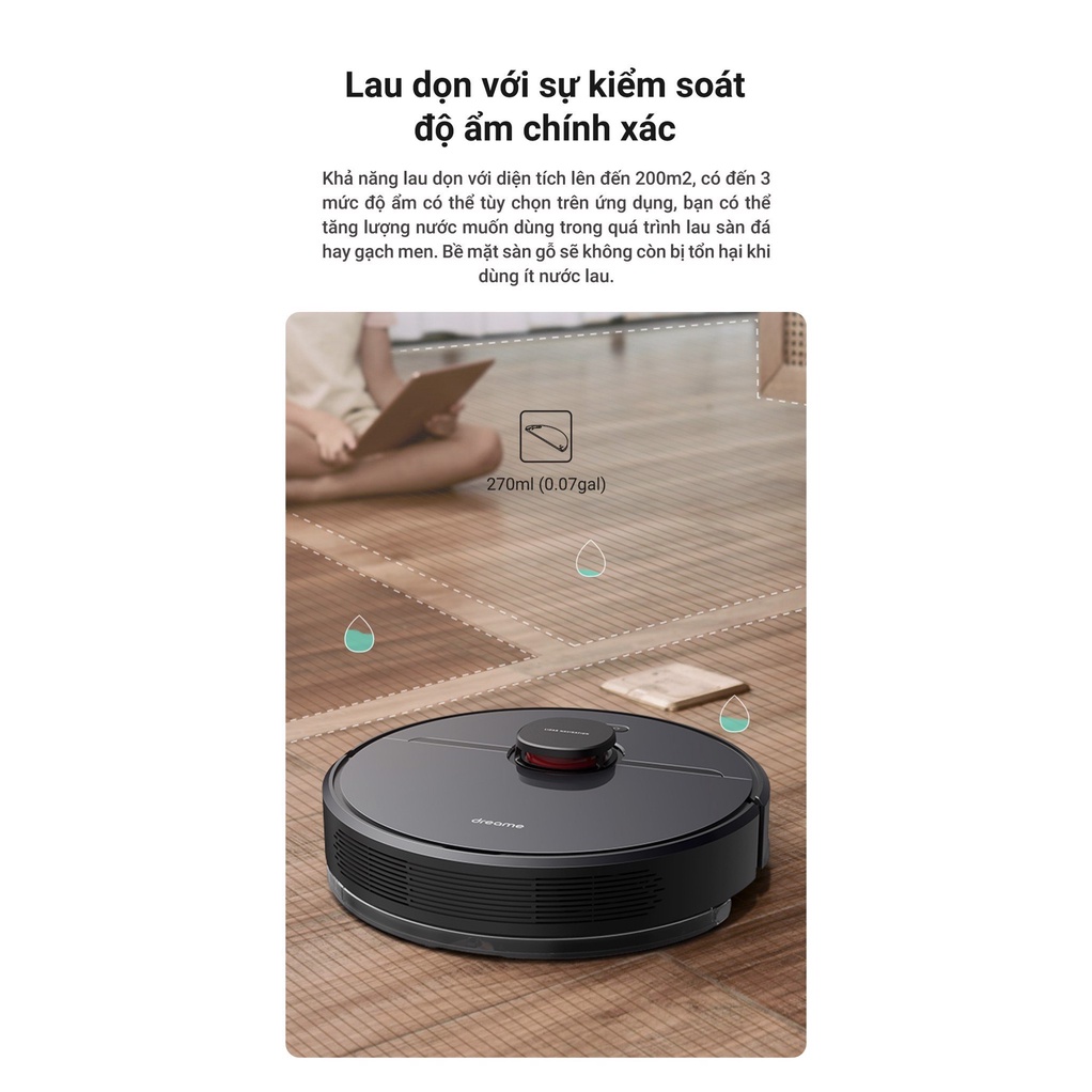 Khả năng lau dọn với diện tích lên đến 200m2 , có đến 3 mức độ ẩm có thể tùy chọn trên ứng dụng, bạn có thể tăng lượng nước muốn dùng trong quá trình lau sàn đá hay gạch men. Bề mặt sàn gỗ sẽ không còn bị tổn hại khi dùng ít nước lau.