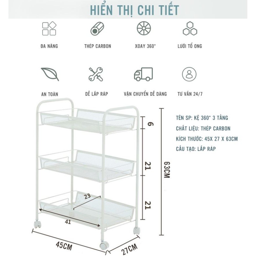 🔺🔺🔺 Kệ để đồ đa năng có thiết kế độc đáo với 3 tầng rộng rãi, bạn có thể để được nhiều dụng cụ, đồ dùng gia đình như: sách báo, gia vị, vật dụng nhà tắm...🔺Bên dưới chiếc kệ đa năng này là hệ thống bánh xe xoay 360 độ di chuyển tiện lợi, giúp bạn di chuyển kệ dễ dàng mặc dù bên trong chứa rất nhiều đồ.