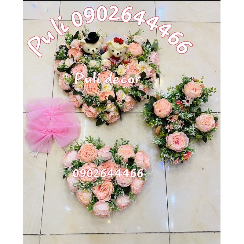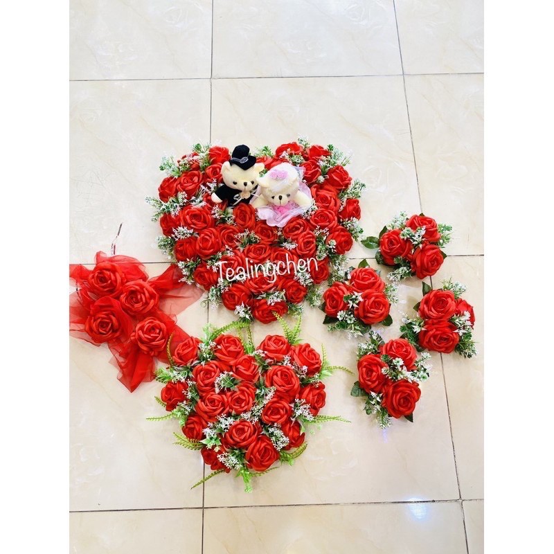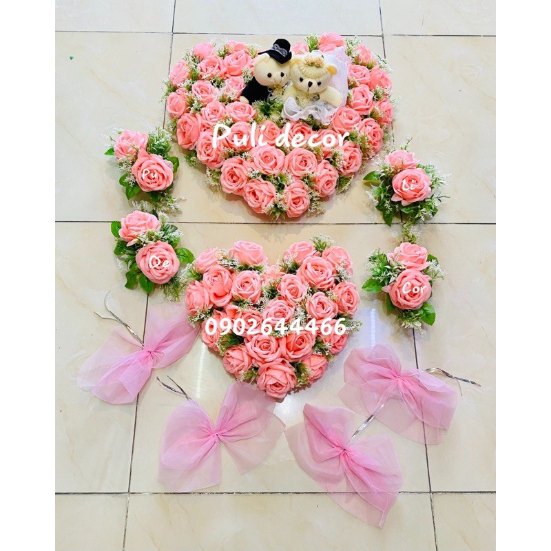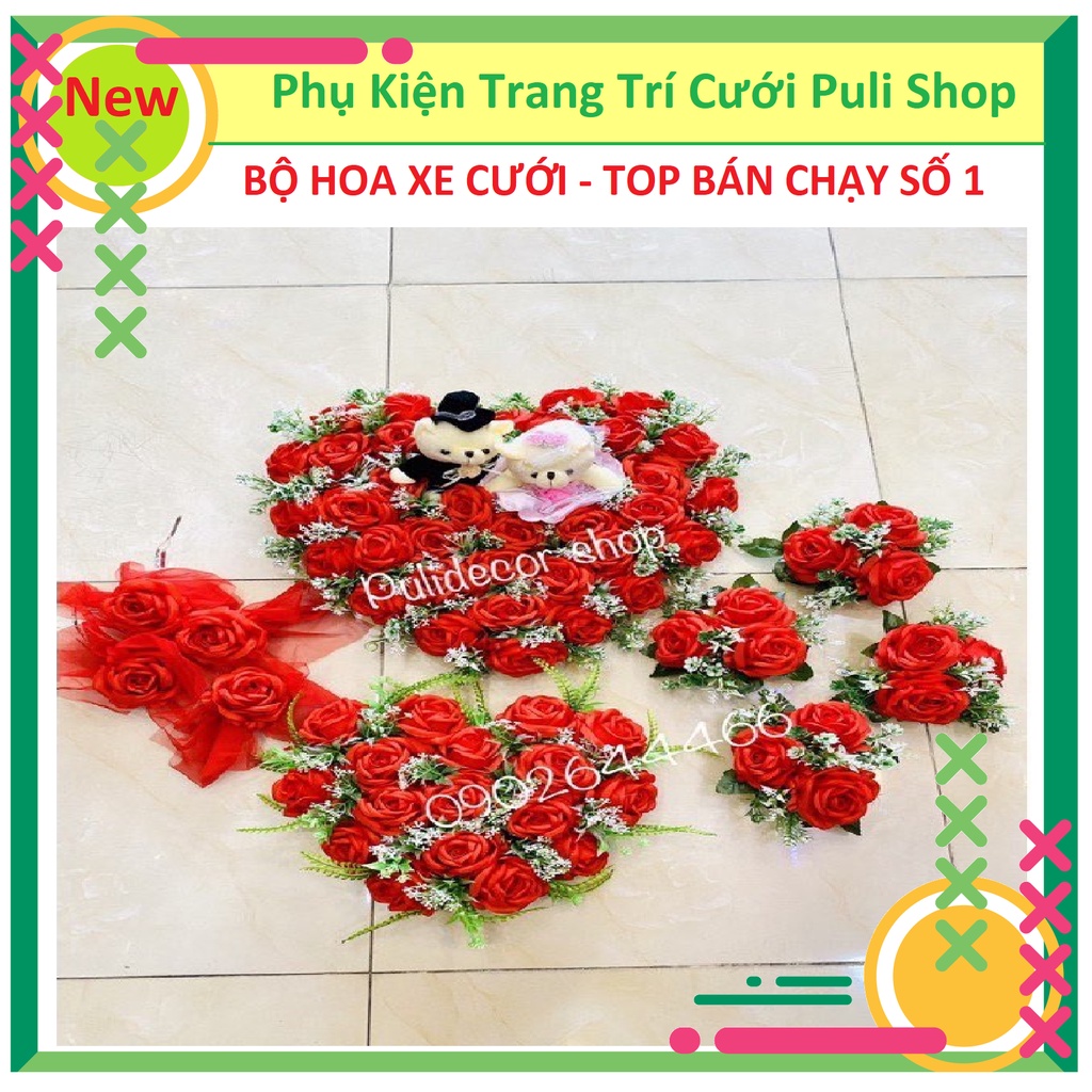 - Bộ Xe Hoa Cưới bao gồm: 1 Tim + Gấu Trước nắp Capo, 1 tim nắp sau cốp, 4 cụm hoa trên nóc xe, 4 nơ gắn cửa. Đầy đủ chi tiết như mô tả.