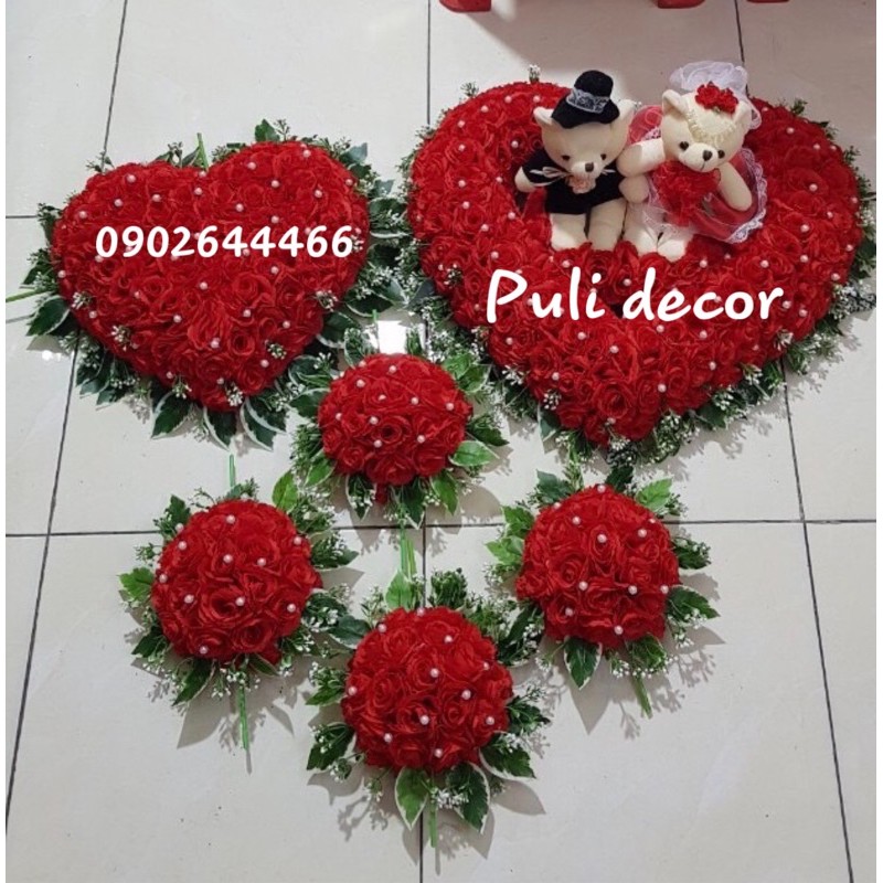 Bộ Hoa Xe Cưới Có gấu - Bộ Xe Hoa Rước Dâu - Bông Xe Cưới Tim Rỗng Có Gấu- Sản phẩm trọn bộ hoa gắn xe rước dâu hàng nhập đẹp lung linh. Bộ xe hoa cưới không đụng hàng, do chính shop thiết kế. Sử dụng toàn bộ hoa vải nhập.