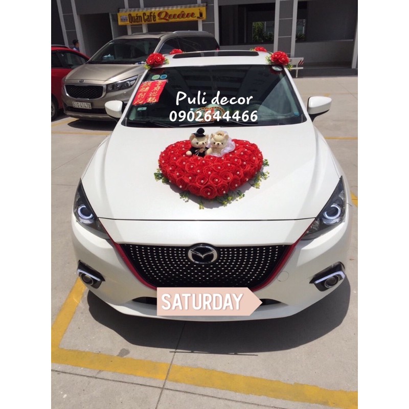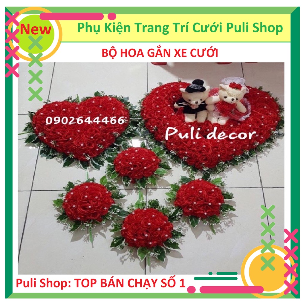 - Bộ Xe Hoa Cưới bao gồm: 1 Tim + Gấu Trước nắp Capo, 1 tim nắp sau cốp, 4 cụm hoa trên nóc xe, 4 nơ gắn cửa. Đầy đủ chi tiết như mô tả.