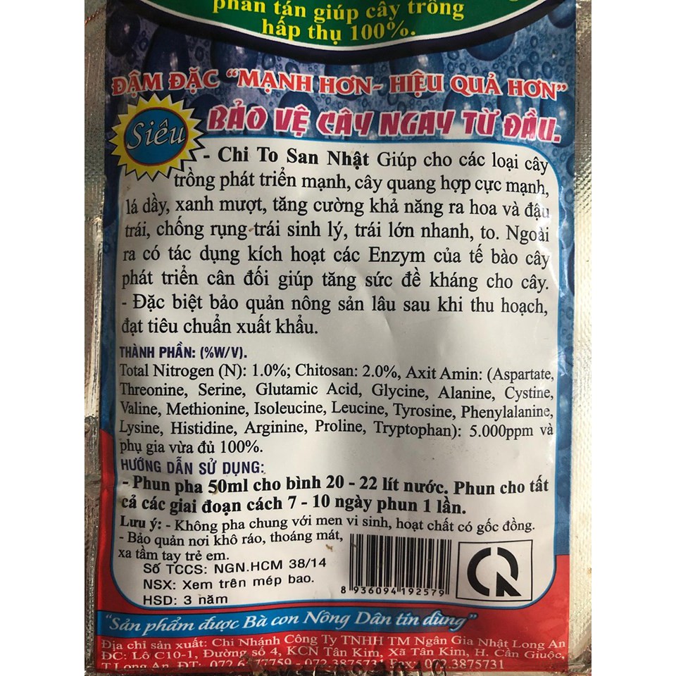 quy cách : gói 50mlGiúp các loại cây trồng phát triển mạnh, cây quang hợp cực mạnh, lá dày, xanh mượt, tăng khả năng ra hoa và đậu trái, chống rụng trái sinh lý, trái lớn nhanh, to.