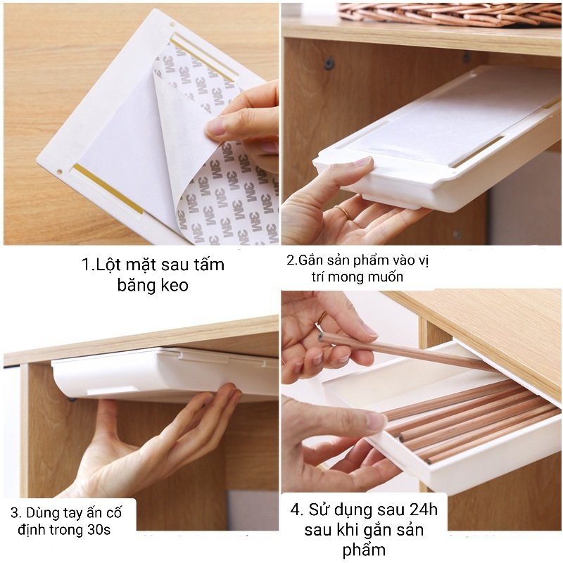 Hộc dán ngăn bàn có thể chứa rất nhiều thứ như bút, thước kẻ, la bàn, khăn giấy, kéo, điện thoại di động vv..Thiết kế một lần kéo và một lần đóng tiện lợi mỗi lần sử dụng