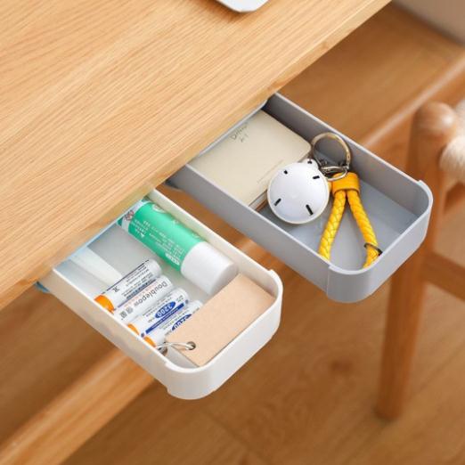 Hộc dán ngăn bàn có thể chứa rất nhiều thứ như bút, thước kẻ, la bàn, khăn giấy, kéo, điện thoại di động ...vv..Thiết kế một lần kéo và một lần đóng tiện lợi mỗi lần sử dụng