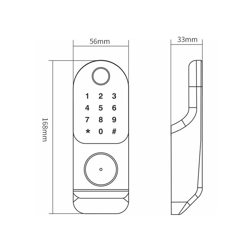 - Kích thước: 168 x 56 x 33mm (Khóa vân tay), 130 x98 x40mm (Khóa cửa)