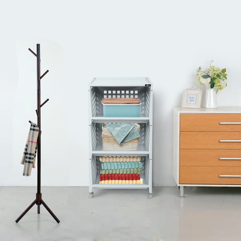 Chiếc kệ nhựa 3 tầng này đã chinh phục rất nhiều khách hàng nhờ tính tiện dụng của nó. Không gian kệ đủ sức chứa nhiều đồ gia dụng, giải phóng không gian cho khách hàng vì mỗi tầng có tải lượng lên đến 1kg. Đặc biệt, thiết kế vuông vắn giúp kệ dễ dàng vừa với tất cả các góc trong không gian nhà, văn phòng. Vì có đến 3 tầng nên kệ được trang bị bánh xe, giúp khách hàng dễ dàng di chuyển mà không cần tháo lắp.- Sản phẩm làm bằng chất liệu nhựa cao cấp, chắc chắn và bền