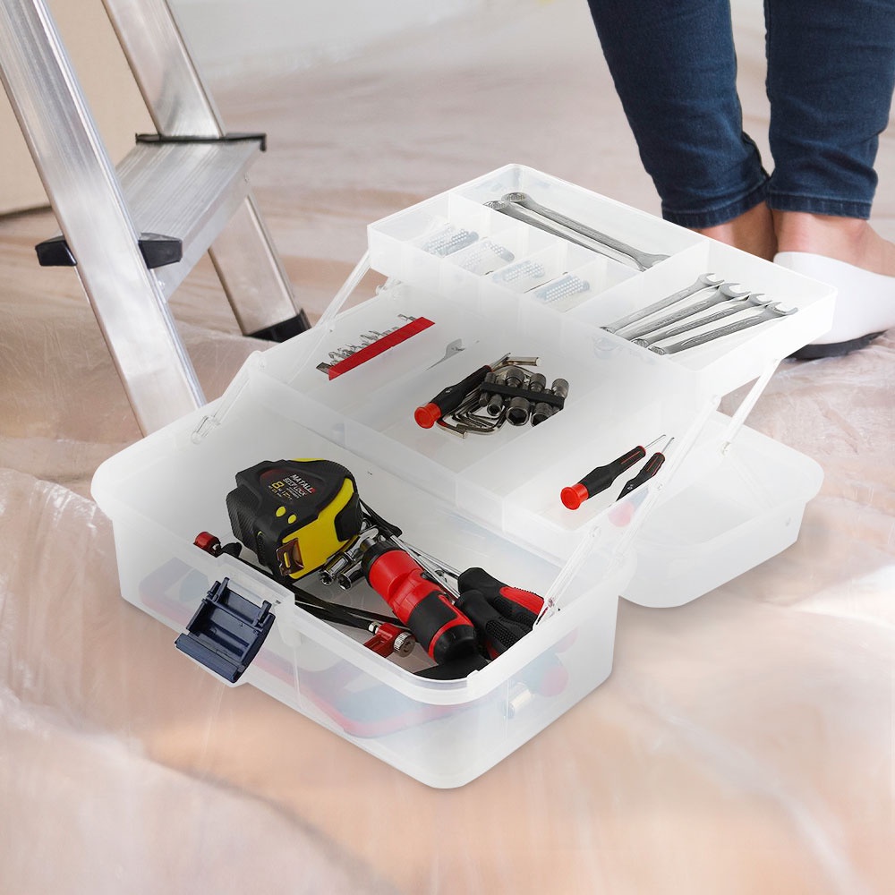 - Hộp đựng dụng cụ có tay cầm có thể tháo rời các tầng để điều chỉnh không gian cho việc sử dụng thuận tiện