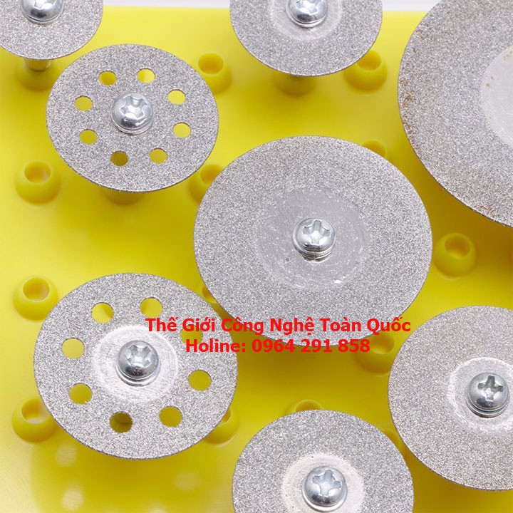 Bộ 10 đĩa cắt kim cương chân 3ly - đĩa cắt kim cương cao cấp hàng hộp - đĩa cắt mini - dĩa cắt miniThông số kỹ thuật: 1 đĩa tám lỗ 25 mm, 1 đĩa tám lỗ 22mm, 1 đĩa tám lỗ 20mm, 40mm 1 đĩa , 30 mm 1 đĩa , 25 mm 1 đĩa , 22mm 1 đĩa , 20 mm 1 đĩa , 18mm 1 đĩa , 16mm 1 đĩa .