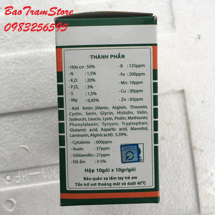 B: 125ppm; Fe: 200ppm; Mn: 10ppm; Cu: 30ppm; Zn: 65ppm; Cytokinin: 600ppm; Auxin: 37ppm; Gibberellin: 21ppm, Axit Amin (Alanin; Arginin; Threonin; Cystin; Serin; Glycin; Histidin; Valin; Isoleucin; Leucin; Lysin; Prolin; Methionin; Phenylalanin; Tyrosin; Tryptophan; Glutamic amic Axit; Aspartic Axit; Mannitol; Laminarin; Alginic Axit): 5,39%;